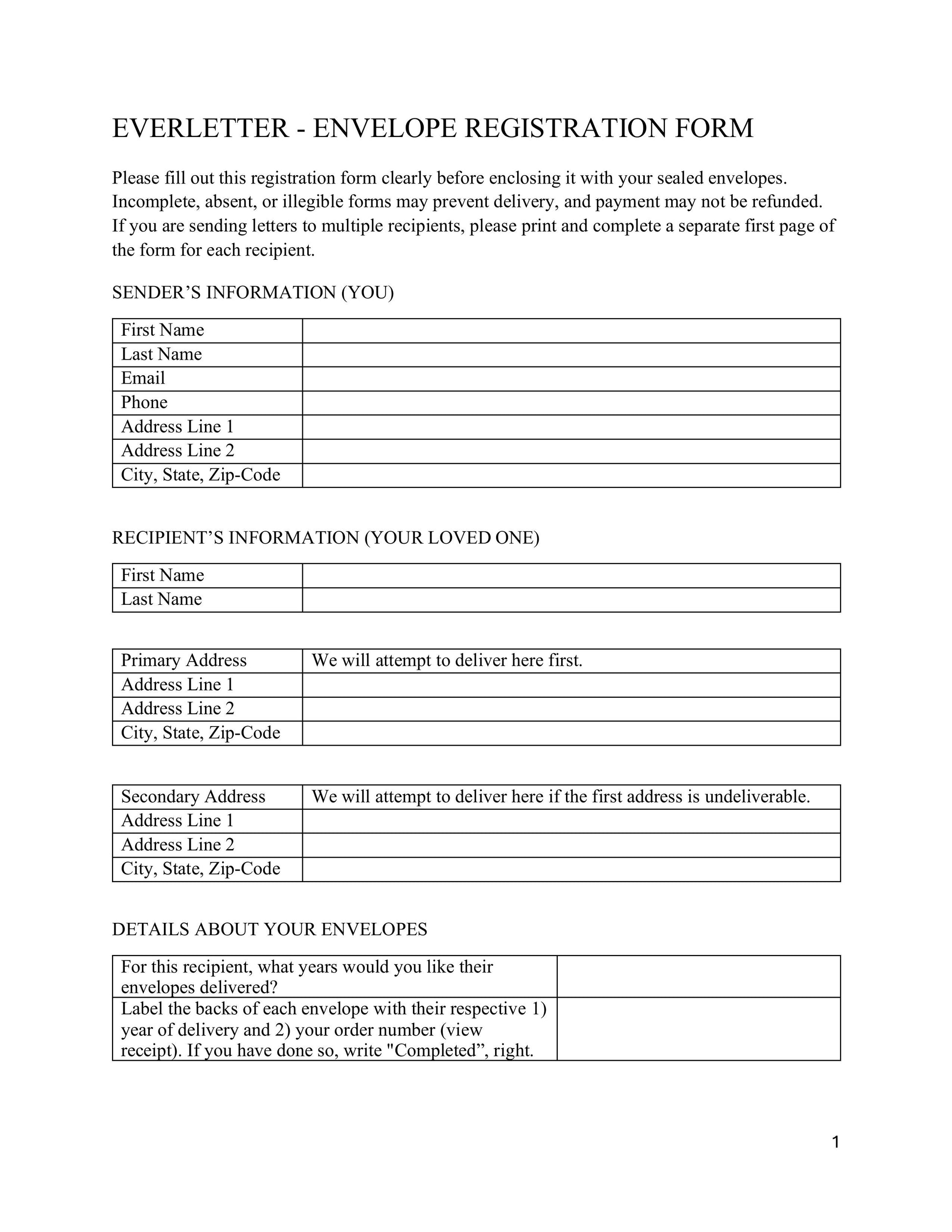 Secure your clients’ letters for future delivery using EverLetter’s pre-paid, long-term service. As a registered partner, you will receive a digital PDF registration form for each envelope. This form captures all necessary details, including order number, sender and recipient information, and delivery year(s)/months(s). Completing and returning the form with your sealed envelope ensures safe storage and reliable delivery up to 20 years in the future.